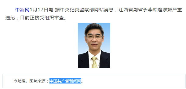 中國中央紀委監察部網站17日宣佈,江西省副省長李貽煌涉嫌嚴重違紀,目前正接受組織審查。
