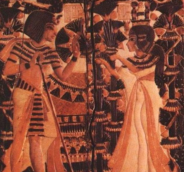 ▲古埃及圖像中,安赫塞娜蒙(右)向圖坦卡門獻花示愛的畫面。(圖/翻攝自維基百科)