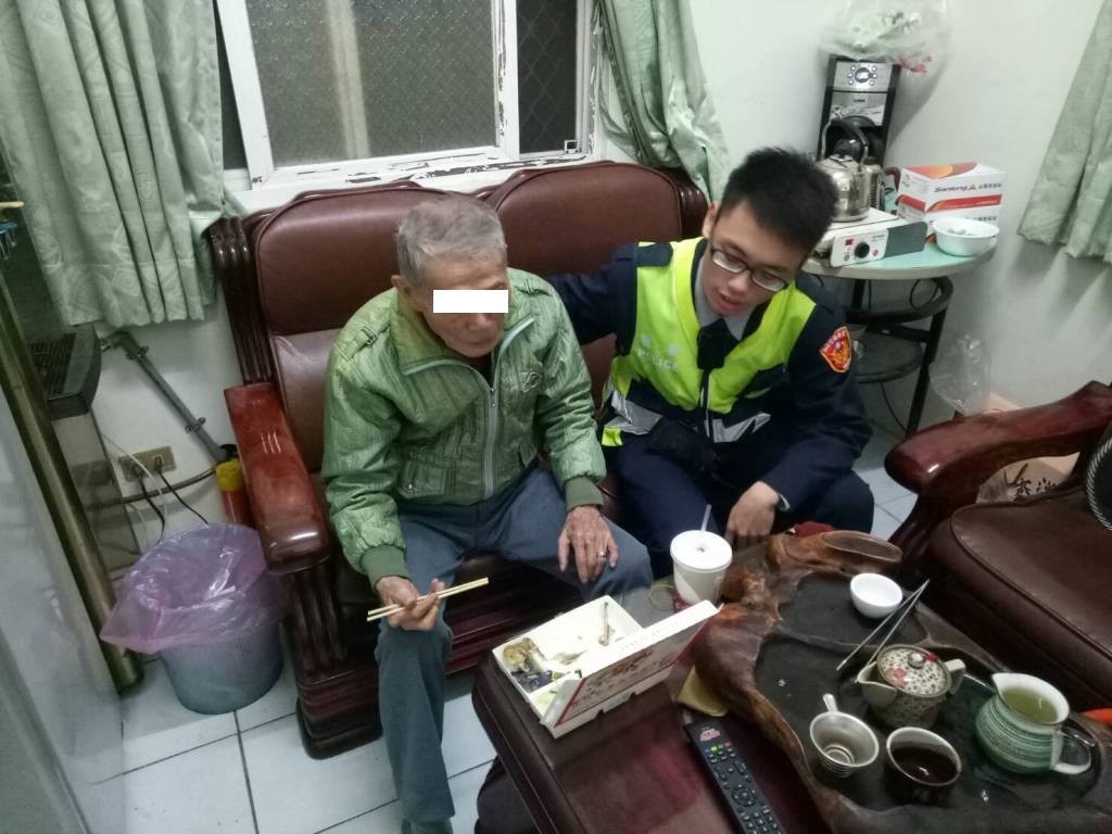 濕冷的冬天卻讓人感到溫暖!雲林縣西螺鎮一名80歲的王姓失智老翁,16日下午出門後就沒回家,原來他在路上被臺西警分局橋頭派出所的員警發現,先帶回派出所內休息,並給他熱茶和便當休息,原先他很靦腆的拒絕,但員警說,「別客氣,我們都可以當你的兒子、孫子了!」要他安心等家人趕到接他回家。
