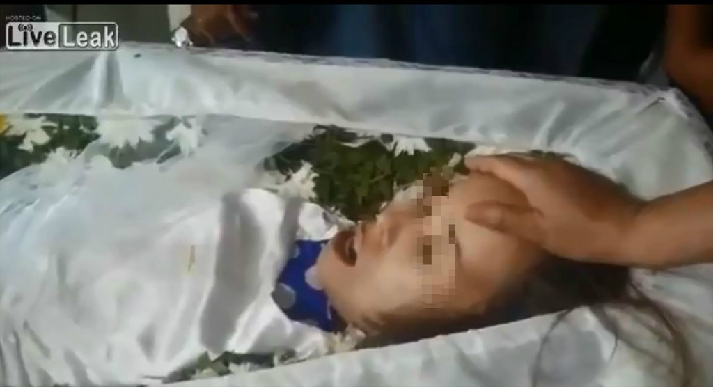 一名網友在影音平台《liveleak》PO出一段影片,畫面中只見白色棺材裡躺著一女童屍體,身上蓋著一件白絲質棉被,一旁隙縫則是塞滿著鮮花。親人則是圍繞在小妹妹身旁,其中一女子伸手摸著女童的額頭、臉頰,隨後再撫摸雙手;另一男子看見女童雙手顫抖後大叫,狂指著手叫旁人觀看,不敢相信眼前看前的影像。