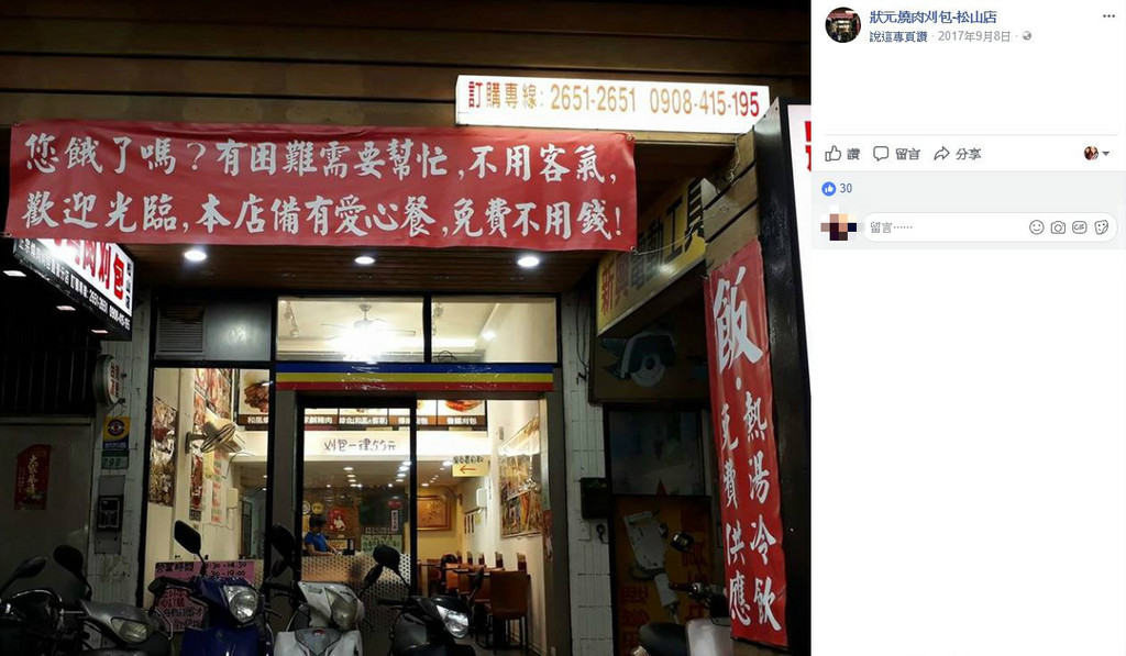 許多餐飲業者都會提供愛心餐點,讓有困難的人也能填飽肚子,不過卻頻頻出現濫用亂象。台北市「狀元燒肉刈包」劉姓老闆在店門前掛起紅布條,寫上「有困難需要幫忙,不用客氣,本店備有愛心餐,免費不用錢」,卻發現有工作能力的民眾領取後打卡分享,甚至提供洗碗的工作機會,也被以「天氣太冷」拒絕。