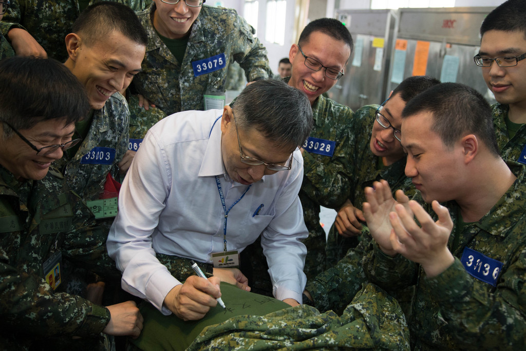 台北市長柯文哲22日赴宜蘭勞軍,先到陸軍步兵第153旅,接著來到蘭陽地區指揮部及海軍168艦隊慰勞北市役男,一路上都受到熱烈歡迎,還與役男一同享用麥當勞,過程有說有笑,簽名、合照來者不拒。柯文哲也趁機會宣傳台北市的公宅、托嬰托幼等友善青年政策;他還笑說,少子化是國安問題,「等你們退伍後,也幫忙投入『救國』的行列,解決少子化問題。」
