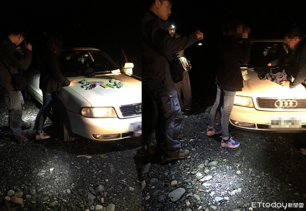 保七總隊第四大隊日前深夜發現河床有車輛遊蕩,行跡顯有可疑,於是上前盤查,發現車上的藍男、王女故作鎮定,又趁夜間視線不清時將1包不明白色粉末丟棄地上,所幸警戒警員眼尖馬上發現毒品予以制止。