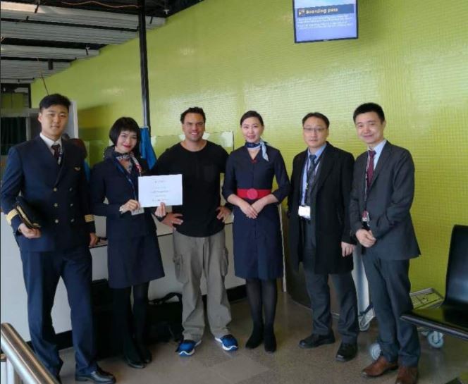 ▲ 費雪(中)與中國東方航空機組人員的合照。(圖/翻攝自@AndrewFisherNZ推特,下同)