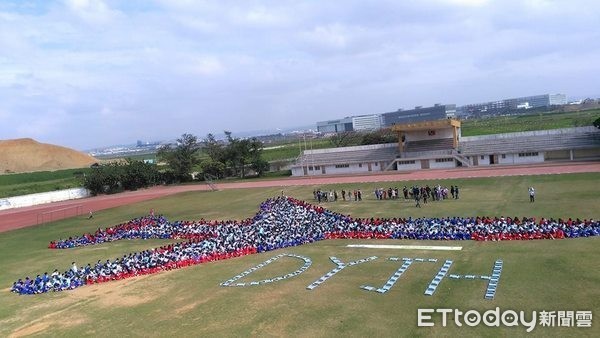 ▲大園國中師生們在園中大操場排成飛機圖形,將手上的紙飛機騰空射出,象徵新園中時代的來臨。(圖/大園國中提供)
