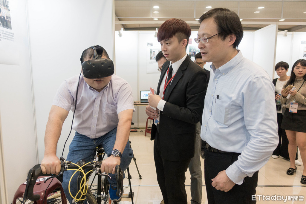 ▲ 世新大學董事長周成虎(左一)體驗世新資管系學生開發之VR單車遊戲。(圖/世新大學提供,下同)