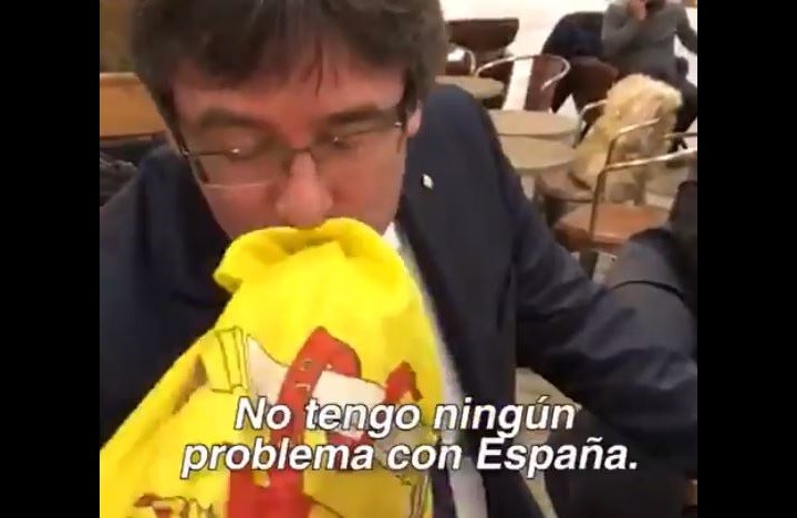 普伊格蒙特這周訪問丹麥哥本哈根時,在購物中心享用咖啡,一名男性民眾接近他身邊,突然把紅黃相間的西班牙國旗拿出來並說,「普伊格蒙特,我這裡有一面西班牙國旗,我知道你喜歡。請拿過去親一下。」普伊格蒙特笑著說自己對西班牙國旗「沒有意見」,還親了國旗2次。
