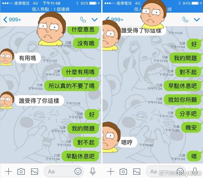 原PO很想搞清楚狀況,晚上11點多還狂傳訊息與女友溝通,當他看見「誰受得了你這樣」的字樣後很心累,只好回「好,我的問題,對不起,早點休息吧,就如你所願,分手吧,晚安。」而女友似乎也答應了,冷漠回個「嗯哼」結束這一個話題。