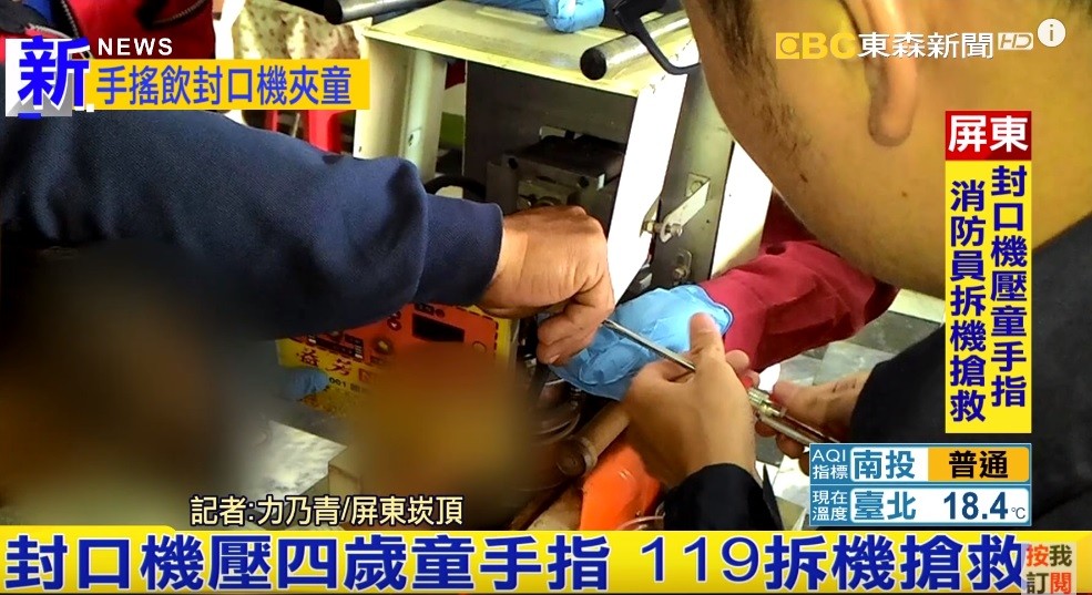 屏東縣消防局指出,男童家長在該家泡沫紅茶店上班,為方便就近照料,因此將男童帶往工作場所,不料男童卻趁著家長不注意,將右手伸入飲料封口機中,手指立刻卡在機器內難以脫困。