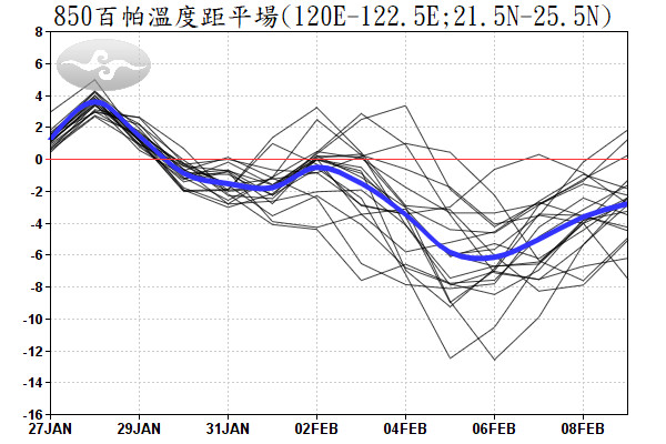 氣象局表示,2月1日(下周四)另一波更強冷空氣影響台灣,各地氣溫再度下降,水氣減少,轉為乾冷的天氣型態。依據850百帕溫度距平場圖,2月初氣溫呈現持續下降趨勢,預期這波可能達強烈大陸冷氣團或更冷的程度,感受上會明顯比上一周寒冷,「冷!好冷!超冷!可能是未來兩周將感受到的」,一波波冷空氣將讓全台感受到冷中還有更冷的寒意。