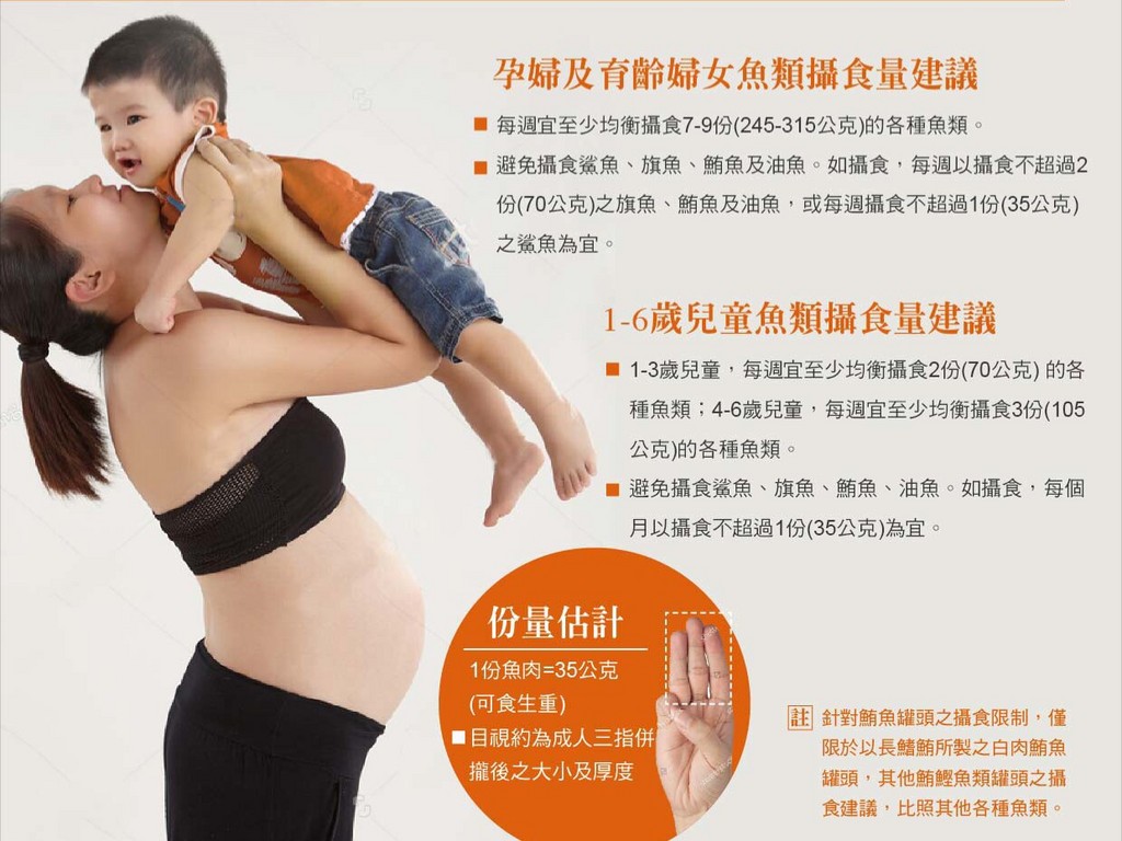 但畢竟魚類含有豐富的維生素、礦物質、omega-3,亦是優良蛋白質的來源,對健康有許多益處, 不論是哪個族群,都應該攝取。因此建議平常多以中⼩型魚或是養殖魚取代大型魚,既能攝取到 許多有益的營養素,也能減少過多有害物質對健康產生的危害。