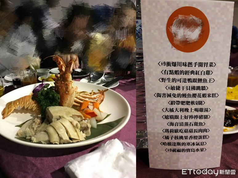 另外餐後還有「橘子核桃果香橙蛋糕」、「哈根達斯的寒冰氣息」與「+9祝福的寶島水果」,滿滿13道宴席菜色吃飽吃滿。任職於遊戲業的網友表示,菜單一上桌就讓大家笑翻,「一開始很期待,看到菜端上桌才恍然大悟。」