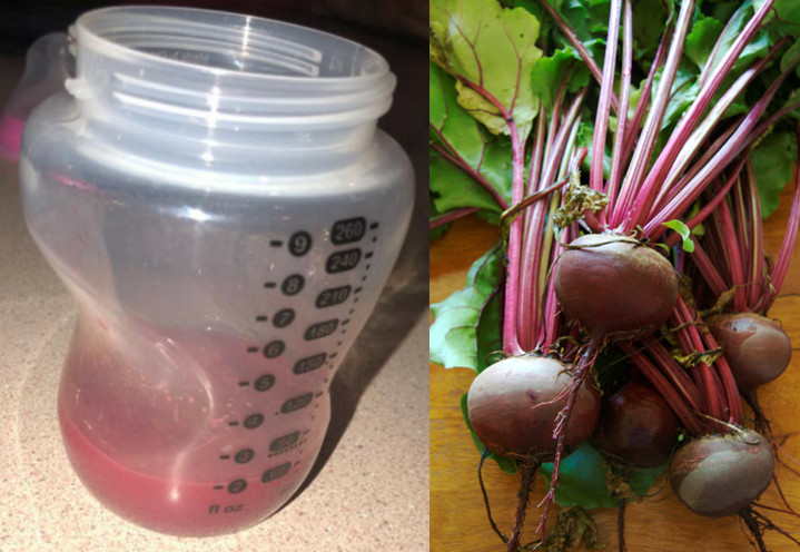 幸好,經過冷靜思考後,這名媽媽發現可能與當天吃的飲食有關,哺乳前她曾吃了甜菜沙拉三明治和新鮮甜菜汁,攝取太多甜菜造成乳汁變色,對寶寶的健康沒有影響,這才讓她鬆了一口氣。