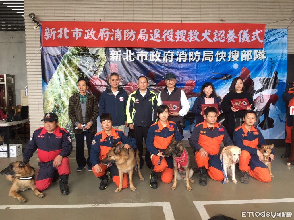 新北市消防局今(27日)舉行退役搜救犬認養儀式,表揚9隻搜救犬長期以來對消防救災的辛苦奉獻,消防局在106年度透過官方網頁開放報名,從25名報名者中選出5位善心民眾,並利用1個月試養期觀察退休犬生活情形,確定狗狗都能找到「幸福歸宿」,才在農曆生肖狗年舉辦搜救犬認養儀式,放心送養。