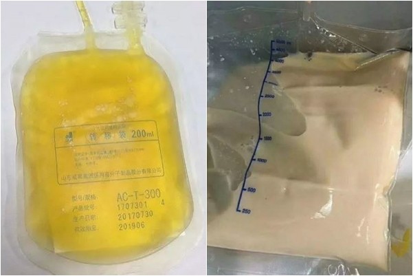 ▲正常的血漿應呈現淡黃色透明狀(如圖左),但小琳抽出的血漿卻是如同固體豬油一般的「奶茶色」。(圖/翻攝《錢江晚報》)