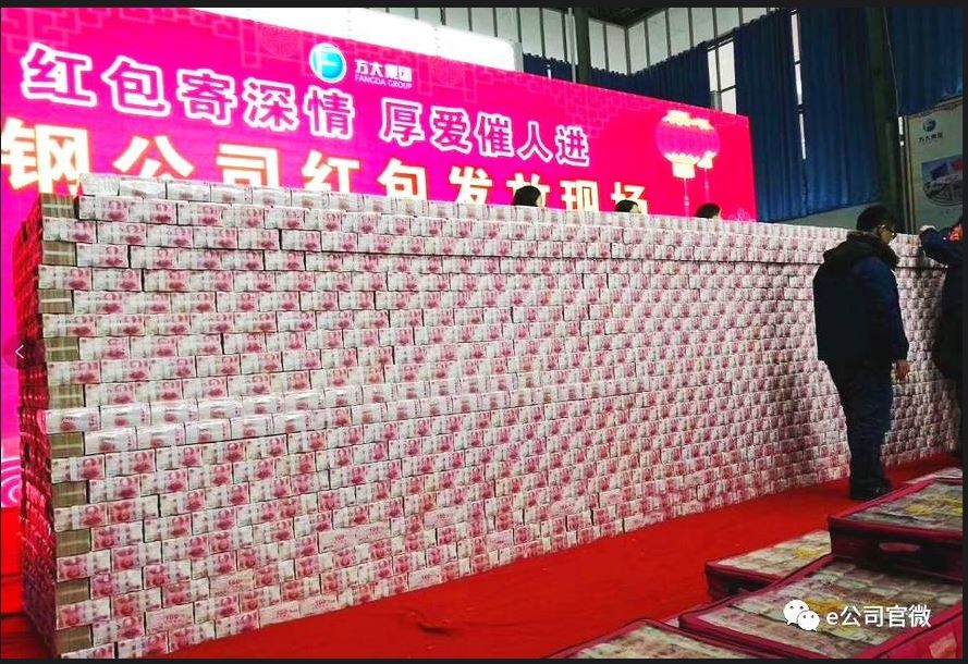 江西方大集團九江萍鋼鋼鐵有限公司(簡稱九鋼)日前向員工發放年終獎金,居然是用一疊疊百元鈔票堆成超過1.5公尺高的「現金牆」,粗略估計總共有5億多元(約23億台幣)。每名員工平均可以爽拿約5萬人民幣(約23萬台幣)大紅包,連上班一個月的都可以拿到4000多元(人民幣,下同)。