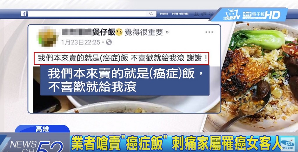 焦到像在吃碎石頭!高雄一名陳小姐日前到某港式餐館吃「煲仔飯」,不料餐點上桌後,飯底的鍋巴竟然嚴重焦黑,只好拍下照片在自己的臉書上抱怨;而業者發現後,竟然截圖轉發到粉絲團,還猛嗆「我們本來賣的就是(癌症)飯,不喜歡就給我滾,謝謝!」令陳小姐感到相當受傷,「我公公大概幾個月前,就是因為癌症走的……!」