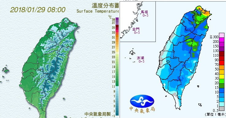 氣象局表示,今在強烈大陸冷氣團影響下,各地氣溫偏低且越晚越冷,嘉義以北及宜蘭清晨低溫約11至13度,全台最低溫出現在新屋10.7度,其他地區低溫14至16度;由於北方的冷空氣強盛,即使在白天氣溫上升幅度也很小,尤其北部高溫僅13、14度,到了晚上將降到11、12度,一整天屬於濕冷型的天氣,全台除高屏高溫仍有19、20度外,其他地區高溫都不超過18度。
