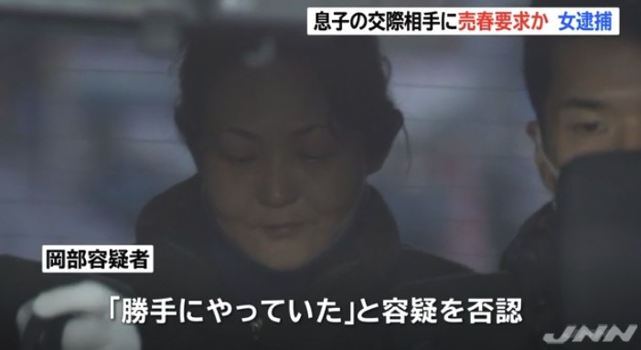 警方調查後發現,少女是岡部容都子18歲兒子的女友,2016年11月離家出走,原想投奔男友,沒想到淪為男友母親的生財工具。岡部容都子不僅強逼少女下海,還威脅「不做就殺了妳」、「自己去賺生活費啊!」整個過程兒子全都知情。警方最後依違反兒童福利法及賣春防止法,將岡部容都子逮捕歸案。