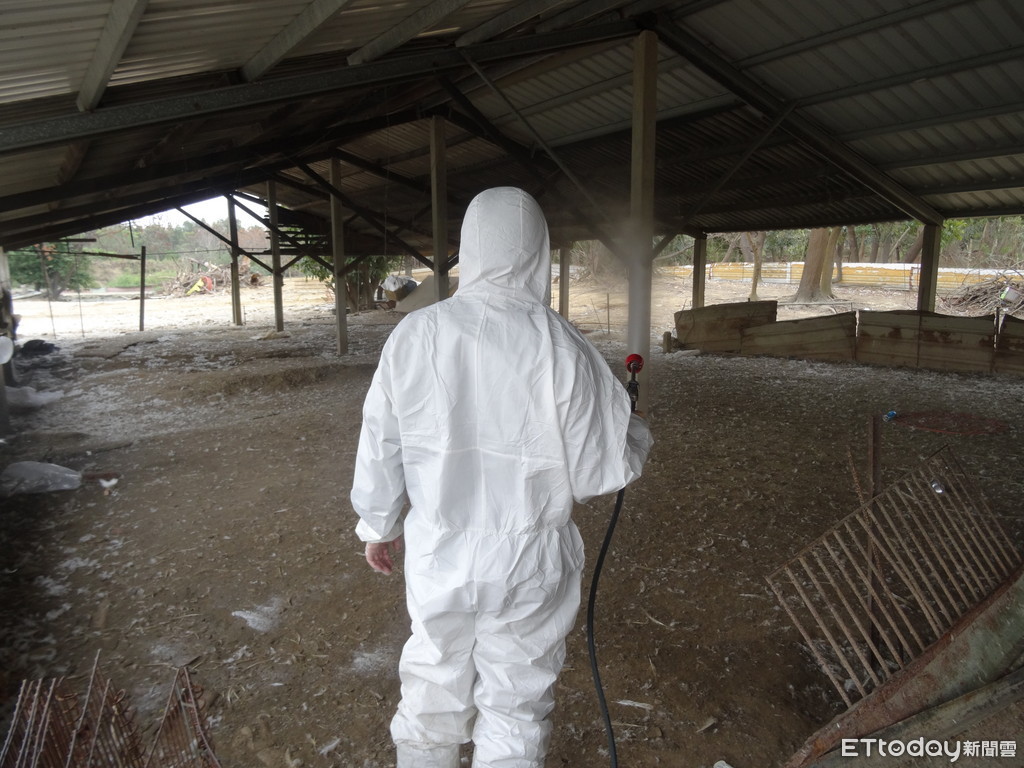 ▲台南市動保處對場內區域及周邊道路等區域進行消毒,以殺滅潛藏於周邊環境禽流感病原。(圖/記者林悅翻攝)