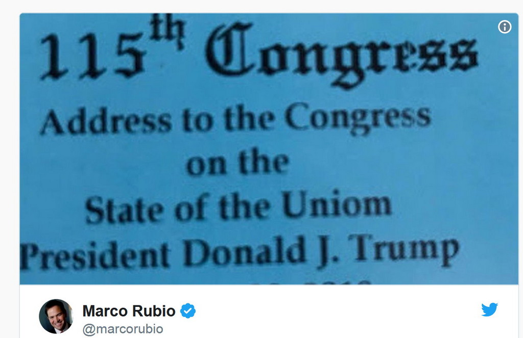 共和黨參議員魯比歐在推特上PO出這張拼寫錯誤的入場券照片。 川普本人應該沒有參與國情咨文演說入場券的印製工作。但過去一年來中,他在社群網站上三不五時就出現拼寫錯誤,並因此飽受批評。