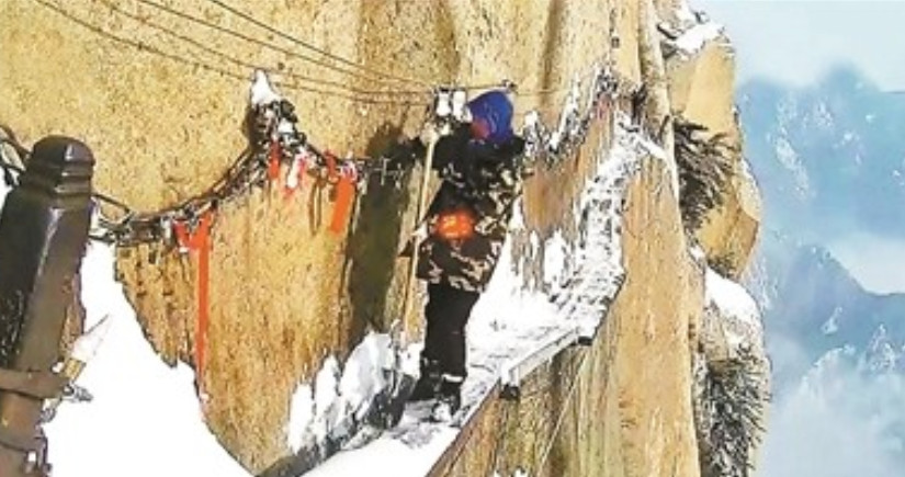 長空棧道是陝西省華山一處景點,近期受到降雪影響關閉,但一段工作人員在華山絕壁除雪的影片卻在網路爆紅。棧道建築在峭壁之上,距離穀底的垂直落差達700多公尺,拿著鐵鍬、掃帚在僅30公分寬的棧道上掃雪,看得讓人膽顫心驚。景區相關負責人表示,因為這項工作對個人健康要求較高,一般護路人大多只能做到30歲。