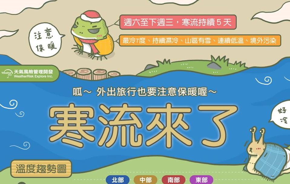 入冬最強寒流今天(2日)晚間南下,天氣風險公司搭配《旅行青蛙》熱潮,推出未來一周溫度預測圖,並提醒民眾5個寒流天氣重點,「呱~外出旅行也要注意保暖喔!」氣象局也發布全台21縣市「低溫特報」(澎湖縣除外),周六(3日)到下周三(7日)清晨易出現10度以下低溫。