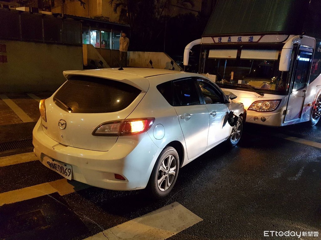 ▲嫌犯最後撞上1輛遊覽車後就棄車逃逸,警方目前仍在追緝中。(圖/記者柳名耕翻攝)