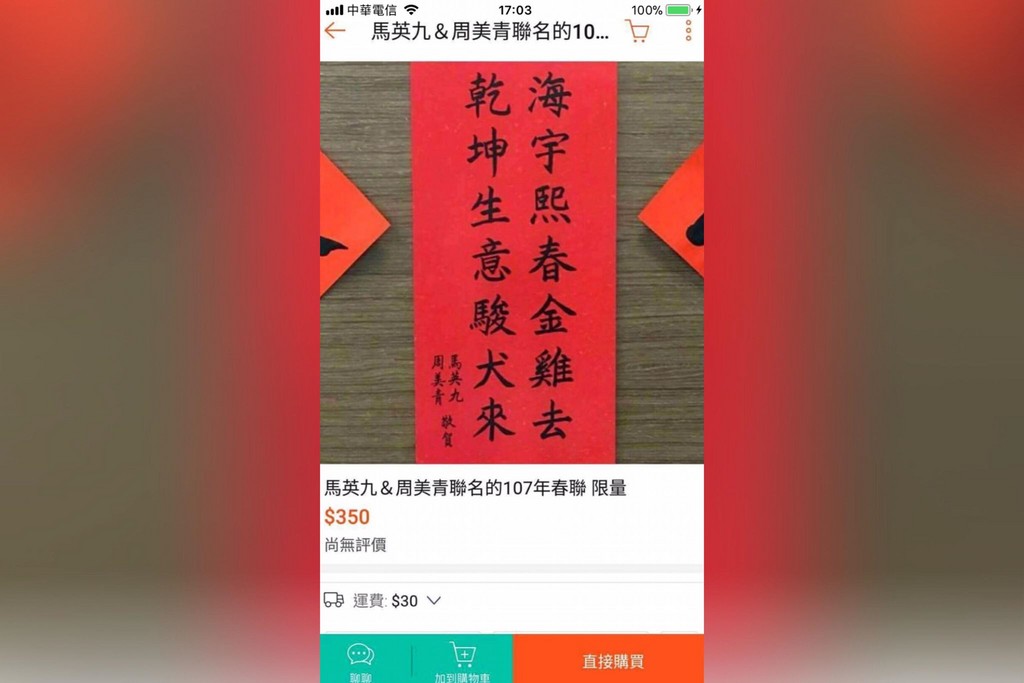 前總統馬英九免費發放親筆書寫後複印的春聯,首波10萬份秒殺,第二波再印6.6萬份一樣索取一空,目前累計已加印至22萬份,近日就將發放,不過,有民眾看準馬英九春聯的人氣旺,網拍上最貴竟喊出350元,而總統蔡英文的春聯一樣網拍上買得到,價格約落在40至60元間。
