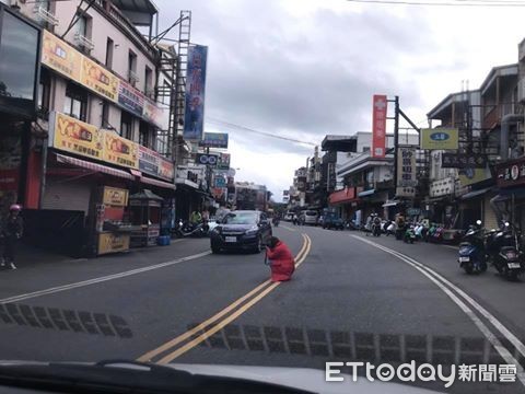 鄭小姐一家人今早開車到墾丁大街遊玩,但是才一進入就發現一名紅衣女子蹲在馬路中央,時間至少超過5分鐘,雖然車子的時速都很慢,大約在10-20左右的速度行駛,雙向的車輛看見這「奇景」都不斷按喇叭。