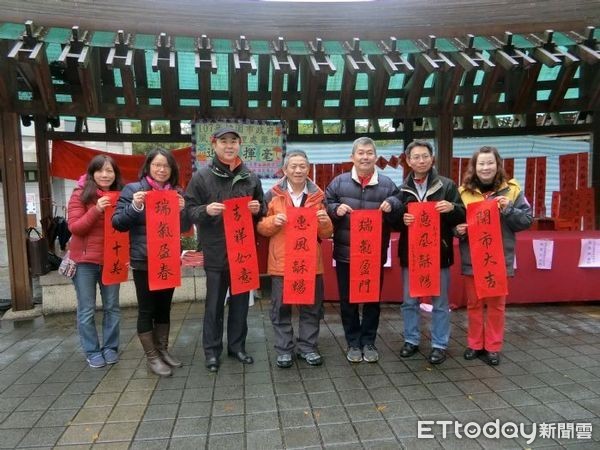 桃園市政府風景區管理處,配合民眾除舊佈新迎接農曆新年的習俗, 4日在虎頭山風景特定區,舉辦107年悠遊大桃園送舊迎新春聯揮毫活動,邀請虎茅庄書會的書法專家老師,帶領風管處志工,共同揮毫寫春聯(圖/風管處提供),現場民眾不畏寒風熱情參與。