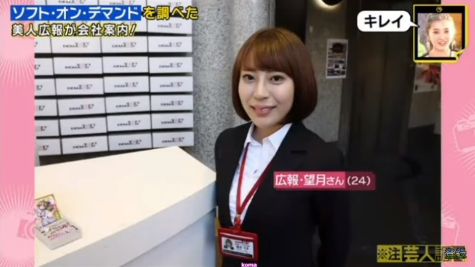 綜藝節目《※注 芸人調べ》2月2日播出的內容中,由男諧星帶隊前往SOD總部參觀,整棟的7層大樓都是辦公室,1樓大廳一進去就是情趣用品、各種潤滑液、保險套免費拿取,廣告部24歲的美女員工望月里莎帶領他們進入參觀。