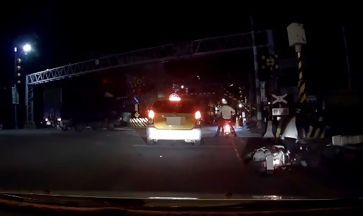 影片中可見,汽車停在行交道前,等待火車通過,正準備起步離開,突然之間開始劇烈搖晃,車身也跟著左右搖擺,前方的機車騎士也穩不住車踉蹌,接著就整台往右倒下,等到結束後騎士才趕緊扶起車輛,背景傳出許多「砰」撞擊巨響,以及汽車的防盜鳴叫聲。