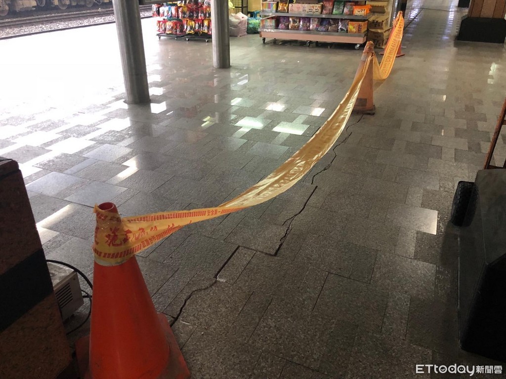 花蓮發生規模6.0地震之後傳出多起災情,花蓮車站方面包含月台出現裂縫、前站通往後站地下道一度淹水,售票電腦故障。《ETtoday新聞雲》記者實際走訪現場,發現車站第一月台處裂縫長達30公分,11車等候區地面也有隆起與裂痕,所幸不影響旅客進出,積水區塊也已經清理,售票系統亦恢復正常。
