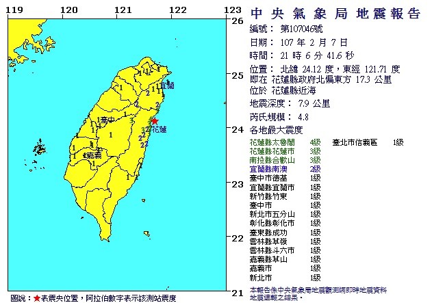 花蓮6日深夜發生芮氏規模6.0強震後,至今仍餘震不斷。中央氣象局發布資訊指出,7日晚間21時6分41秒又再發生芮氏規模4.8有感地震,震源深度7.9公里,震央位於花蓮縣政府北偏東方17.3公里處;各地最大震度為花蓮縣太魯閣4級,花蓮縣花蓮市、南投縣合歡山3級,宜蘭縣南澳2級。