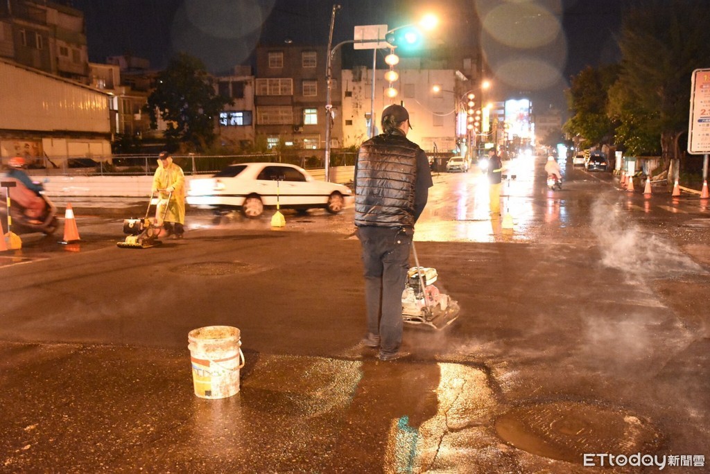 ▲花蓮市公所清查各區災害情形,路面龜裂隆起的情況至少有30起以上,開口廠商晚間冒雨連夜趕工,將路面整平,市長魏嘉賢前往現場勘察。(圖/花蓮市公所提供 下同)