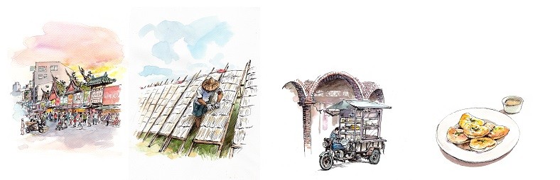 本書還邀請畫家洪明河,繪製多幅作品,或勾勒新竹的街頭風景,或捕捉城隍廟、長和宮前的市井氣息,或描摩柿餅、柴梳餅與糯米湯餃等在地美食,俐落筆觸與細膩用色,盡顯風城的有滋有味。飲食攝影、尋味地圖與店家訊息,則為此書增添諸多實用價值。