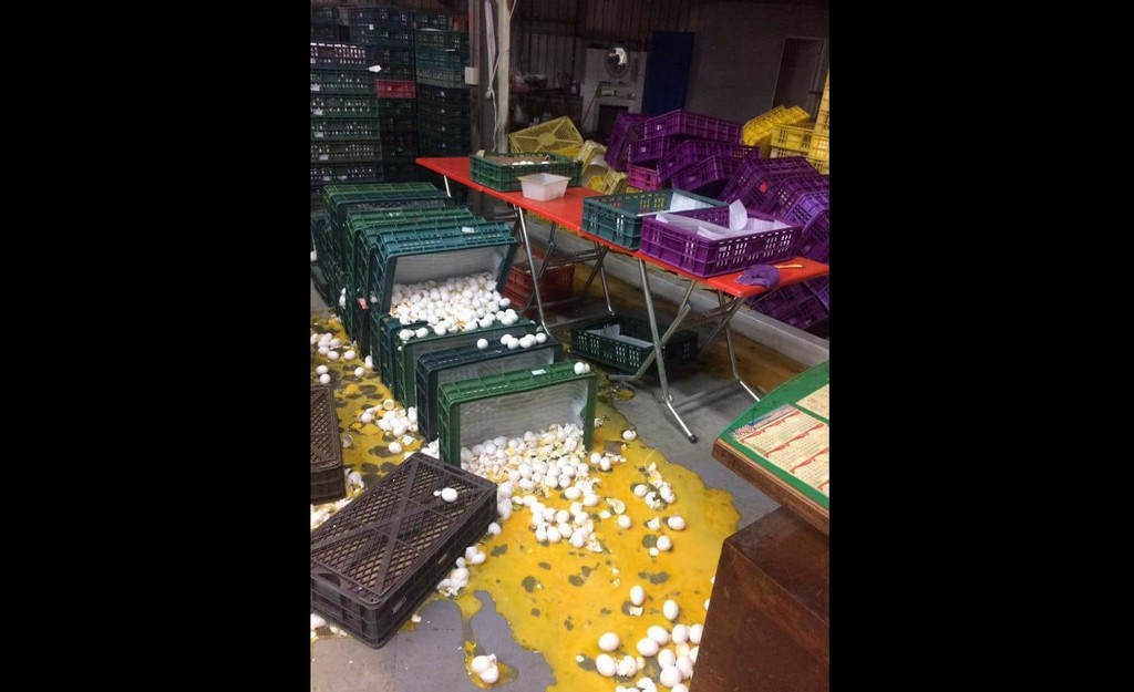 「今天一早,朋友進公司準備送貨時驚呆了!」照片的倉庫中,一箱一箱的新鮮雞蛋層層堆疊,但在地牛翻身的摧殘之下,一疊高高的雞蛋耐不住久震,當場傾斜倒地,直到原PO好友翌日早上上班時才發現整地的破碎蛋殼、蛋液,只能崩潰叫苦連天。