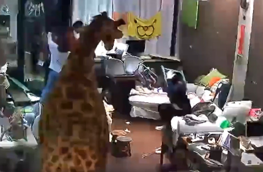 另一個鏡頭中,一群人原本坐在客廳沙發上聊天,地震開始之後,狗狗驚慌得不斷大叫,一群人也趕緊往外逃命,但是坐在沙發上的2名女生,雖然試圖想要站起,但是因為搖晃的關係,無法站穩只能坐在沙發上,彷彿被吸在上面跟著旋轉,只能默默護著頭,等到震度較小才站起,最後把屋內的狗狗一起抱走。