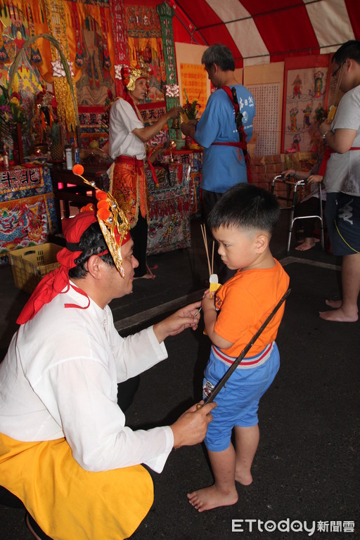 ▲法師為小朋友收驚消災解厄保平安。(圖/記者林悅翻攝)