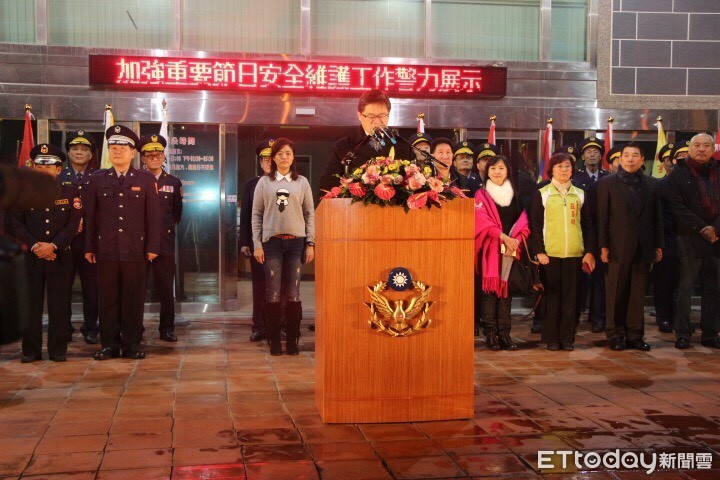 為貫徹讓市民「安心過好年」之決心,台南市警局8日晚上在107年加強重要節日安全維護工作執行首日,結合「安居專案」,聯結社區警政、五力,攜手參與警力展示校閱,警專實習生旗隊進場氣勢、特殊任務編組精湛戰技表演,以及在場警民力隊伍,展現出的堅強陣容,就是對台南治安維護的最大保證。