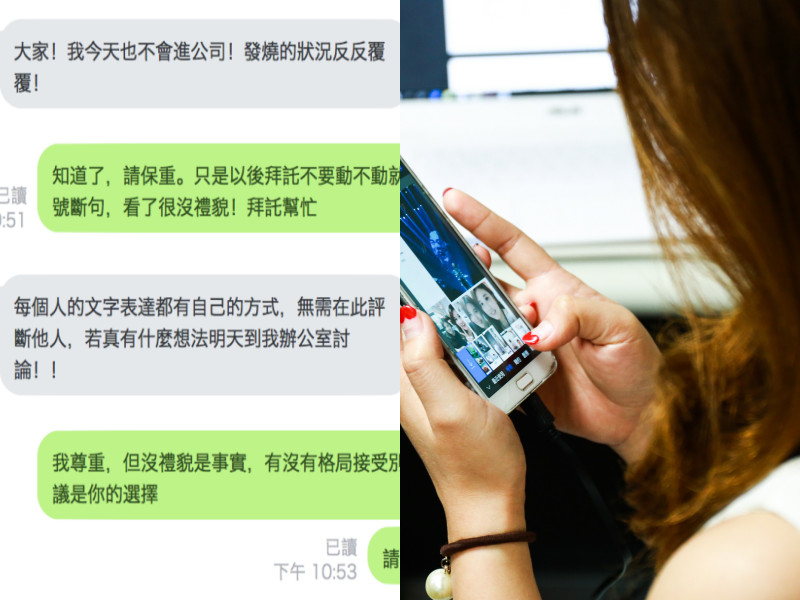 近日,總編輯得了流感,每天都在群組報告病況,說自己發燒了、沒辦法進公司、又得請假。一連四天,原PO實在受不了,因此在群組半正式地提醒:「知道了,請保重。只是以後拜託不要動不動就用驚嘆號斷句,看了很沒禮貌!拜託幫忙」。