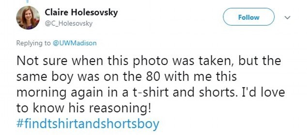 還有一名女網友加了#findtshirtandshortsboy(尋找穿短袖短褲的男孩)的主題標籤。她在推文上寫,「不知道這張照片何時拍的,但這個男孩今天早上跟我搭同一輛巴士,又是短袖T恤和短褲。很想知道他的原因!」
