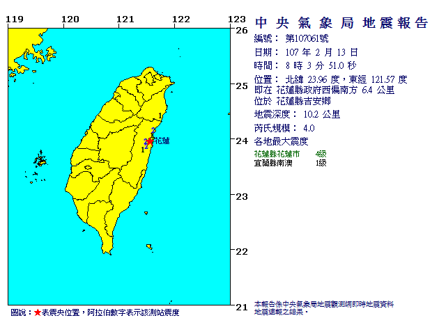 根據中央氣象局的地震報告資料,花蓮縣吉安鄉13日上午8時3分發生芮氏規模4.0地震,深度10.2公里,屬於淺層地震,當地最大震度4級,宜蘭縣南澳1級。