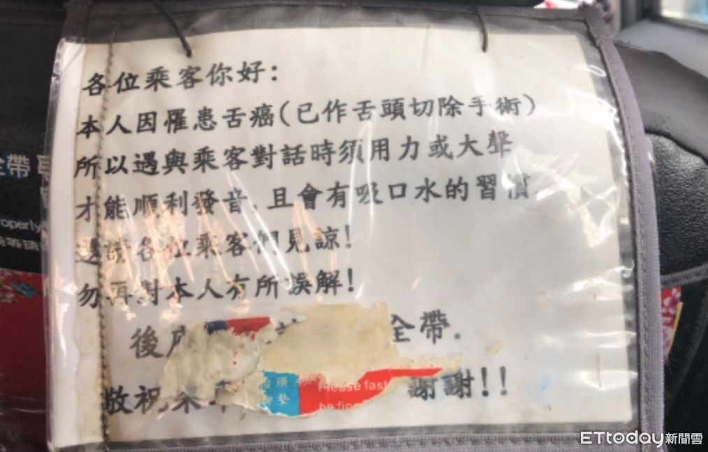 沒有舌頭的罹癌司機,即使發音不清,仍樂觀面對人生。育有2名女兒的許小姐日前在市府捷運站搭乘計程車,一上車,她就看到前方掛有告示,原來是司機希望乘客能多體諒他講話必須特別大聲,才能順利發音的不易,這30分鐘的車程,許小姐跟對方聊得非常愉快,也深刻被司機大哥知足惜福的心態給感動。