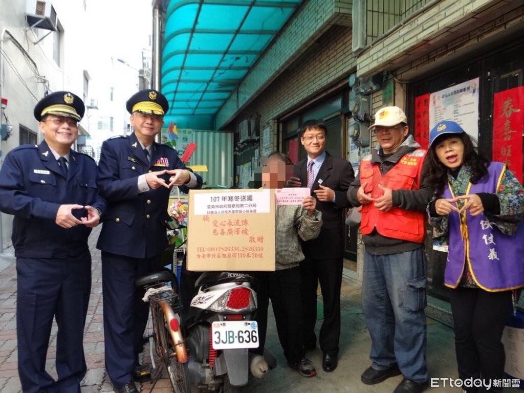 歲末寒冬送暖,台南市警二分局,結合台南愛心慈善會及守望相助隊,發起「107年寒冬送暖、關懷弱勢」活動,由二分局長王森瑒及愛心慈善會理事長施朝桂帶領員警,將民生物資親送到每位獨居長者家中,將愛心直送長者心坎裡,讓他們直呼「揪感心」!