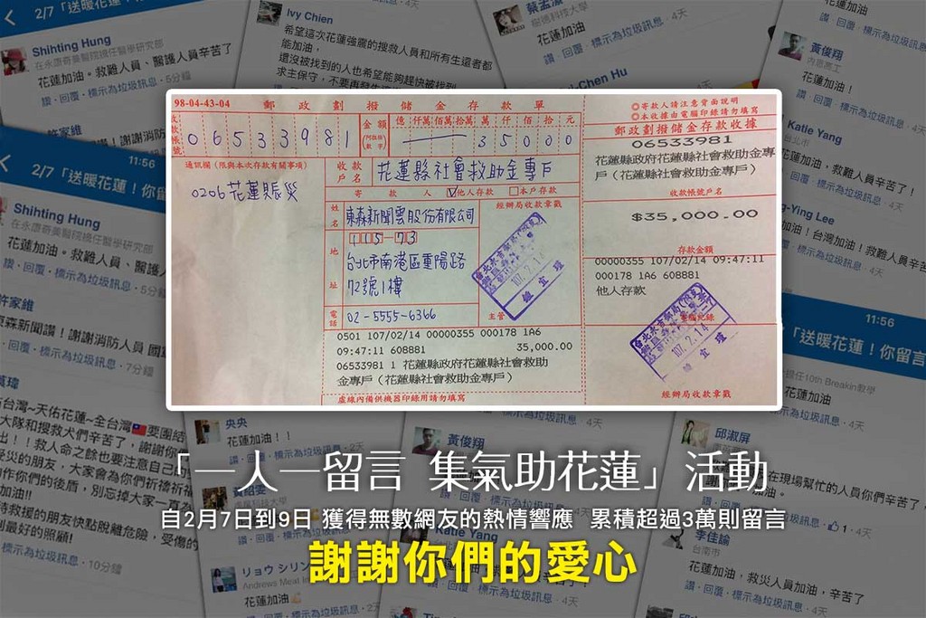 除了雲友們在App活動專區的留言,加上新聞雲、星光雲、鍵盤大檸檬等10個粉絲團的大力分享,一共累積超過3萬則留言。有感於雲友們的熱情響應,ETtoday將所有粉絲團加上App活動區的留言數加總,一共捐出3萬5千元給「花蓮縣社會救助金專戶」。