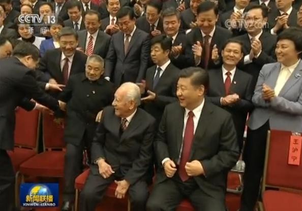 ▲習近平親自挪開座位,讓座給「中國核潛艇之父」黃旭華,溫暖舉動感動全場。(圖/翻攝自央視)