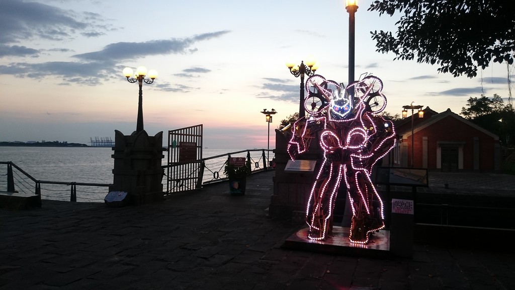 另外,在淡水海關碼頭,則有拆除60餘輛廢棄腳踏車的腳踏板、變速輪、前叉、把手等零件,組裝而成的真實版大黃蜂「鐵馬金剛」(Bike Bumblebee),是以廢棄物變黃金的環保概念拼裝成大型裝置藝術;且園區內還有洋樓、兩座日據時代建造的港務倉庫可供參觀,也因位於淡水紅毛城下坡的低矮平台上,視野相當良好,民眾不僅可於園區河畔遠眺關渡大橋,還可以一覽淡水河口夕陽美景,四周景觀盡收眼底。