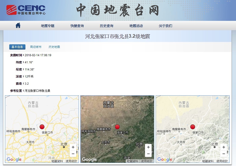 中國地震台網測定,河北張家口市張北縣14日下午5點許發生規模3.2地震,北緯41.16度,東經114.38度,震源深度達12公里,目前尚未得知是否有人員傷亡。